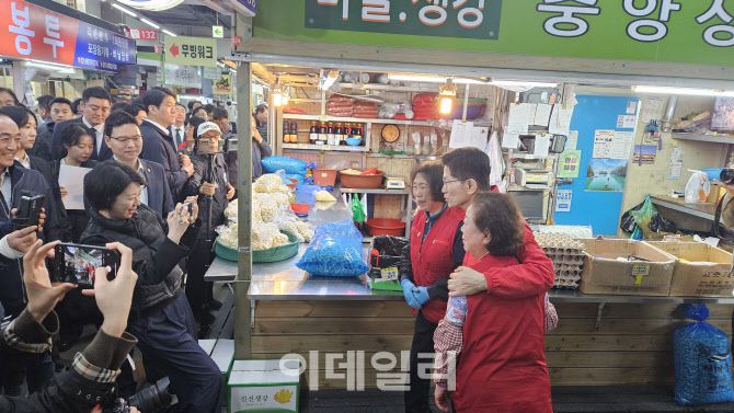[이데일리 박민 기자] 김문수 국민의힘 대선 후보가 제21대 대통령 선거 공식 선거운동 첫날인 12일 오전 5시 서울 송파구 가락시장을 찾아 상인들을 만나며 선거운동을 시작했다. 상인들은 이날 김 후보에게 “국회에서 싸우지 말고, 집값 잡고, 서민들 살기 좋게 만들어달라”고 당부했다. 이날 선거 운동에 배석한 배현진(서울 송파구을) 국민의힘 의원이 상인들과 인사를 나누던 김 후보와의 기념촬영을 돕고 있다.