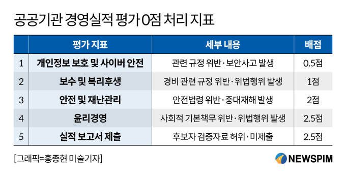 기재부가 발표한 '2025년도 공공기관 경영평가편람'에 따르면, 총 5개의 지표들에서 중대한 위반이 발생할 경우 계량 여부와 관계없이 0점을 부여한다. 해당 지표들은 ▲개인정보 보호 및 사이버 안전 ▲보수 및 복리후생 ▲안전 및 재난관리 ▲윤리경영 ▲실적보고서 제출(허위·미제출) 등이다.