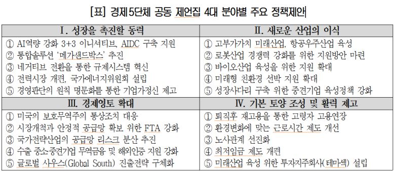 “외환위기와 글로벌 금융위기, 팬데믹 등 수많은 시련 속에서도 한국경제는 뿌리를 내리고, 열매를 맺으며 성장해 왔지만 저성장·고령화 고착화와 보호무역주의 확산, AI기술혁명과 같은 격랑에 점점 생기를 잃고 있다.”- 대한상공회의소, 한국경영자총협회, 한국경제인협회, 한국무역협회, 한국중견기업연합회(가나다순) 등 경제5단체