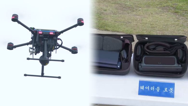 순찰 장비 무게를 덜어줄 착용형 로봇, '웨어러블 수트'도 등장했습니다.