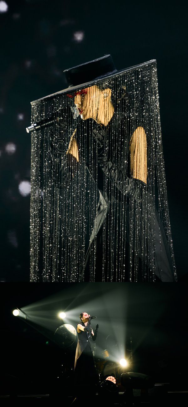 이날 나카시마 미카는 모자 챙에 달린 줄 베일을 다리까지 길게 늘어뜨린 화려한 의상을 입고 등장해 '알고 싶은 것 알고 싶지 않은 것' '가장 아름다운 나를' '꽃다발'로 공연의 포문을 열었다. 그의 화려한 눈화장과 특유의 독보적인 음색은 시작부터 공연의 몰입도를 높였다.