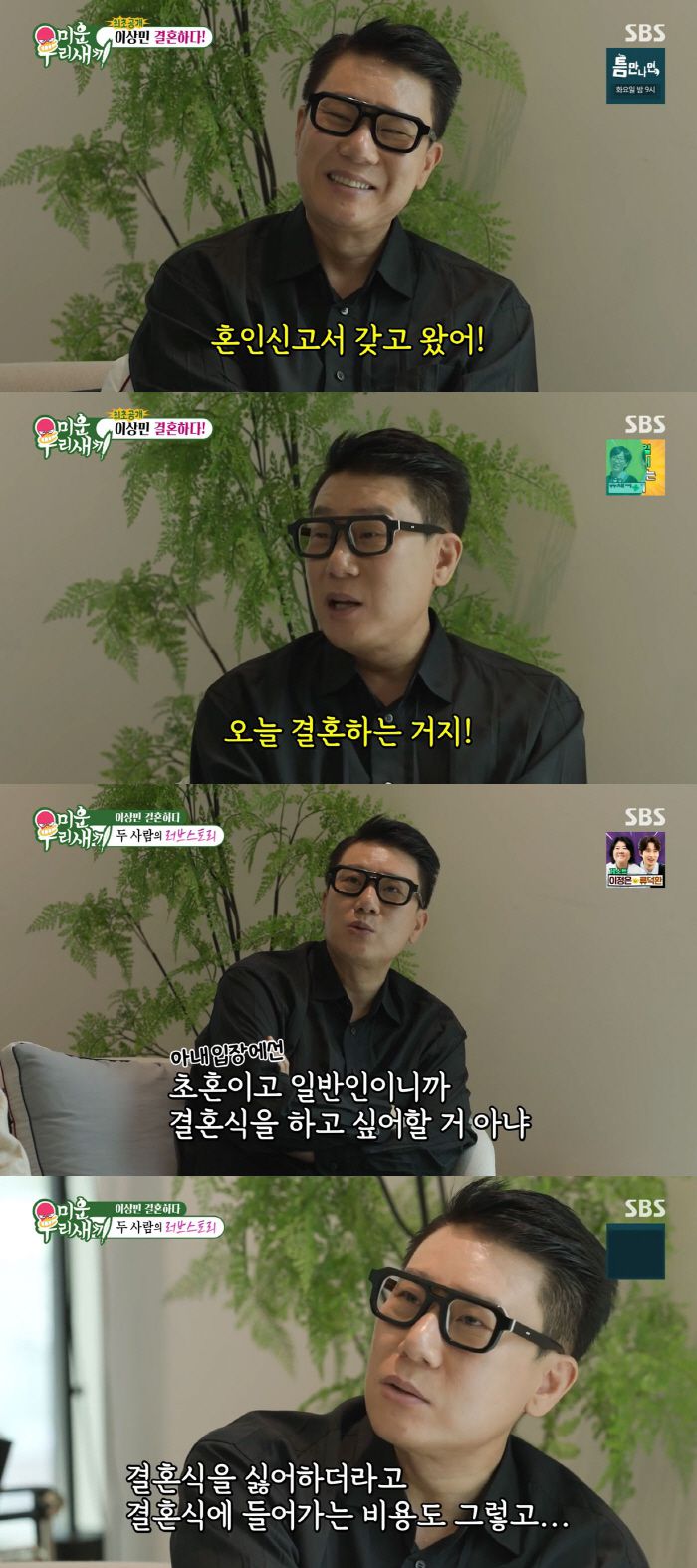 이상민은 지난해 비즈니스를 통해 알게 된 10세 연하의 일반인 여자친구와 교제 3개월 만에 결혼을 결심했다고 털어놨다. 아내는 초혼이었지만, 그의 의견에 따라 결혼식은 올리지 않기로 했다고. 그래서 혼인신고가 결혼식 대신이 됐고, 신혼집에는 6월 이사하기로 했다고 설명했다.