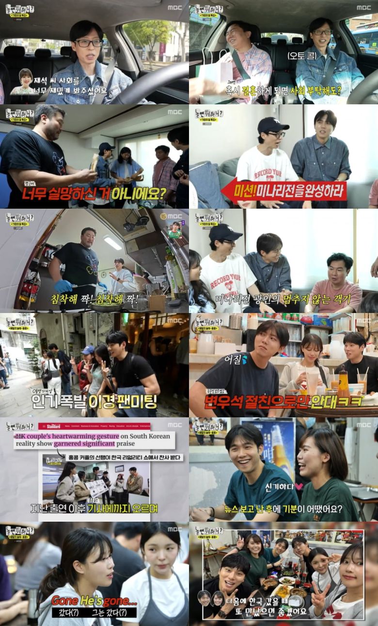 ‘홍콩 커플’ 제이콥과 트레이시는 ‘놀면 뭐하니?’에서 한 양심 선행이 홍콩 뉴스 기사까지 오른 후기를 전했다. 제이콥과 트레이시는 “친구, 가족들이 기사 링크를 보내줬다”, “너무 신기했다”라고 말하며 홍콩까지 와준 멤버들을 반겼다. 주우재는 “두유노(Do you know) 변우석?”이라고 묻는가 하면, MBTI 토크의 물꼬를 트면서 ‘홍콩 커플’과 가까워졌다.