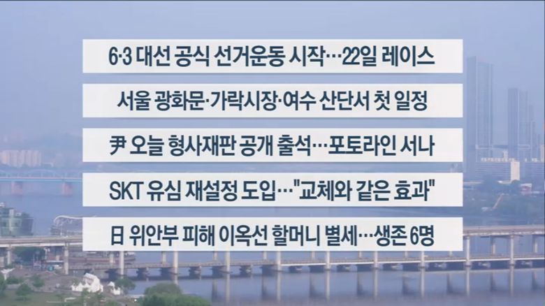 민주당 이재명 후보는 오전 서울 광화문 청계광장에서 첫 유세에 나섭니다. 국민의힘 김문수 후보는 첫 일정으로 서울 가락시장을 찾았고, 이준석 개혁신당 후보는 여수 국가산업단지에서 일정을 시작했습니다.