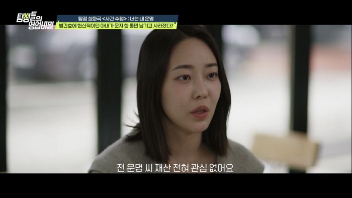 그렇게 시간이 흐르고 주인공은 상태가 악화돼 요양병원에 입원한다. 그런데 입원 한 달 만에 "혼자 있고 싶다"라는 문자만 남긴 채 아내가 사라진다. 주인공은 아내를 찾기 위해 탐정을 고용하고, 그 과정에서 누나가 아내에게 강요해 동생이 사망하더라도 재산을 받지 않겠다는 '혼전서약서'를 쓰게 한 사실이 밝혀진다. 그러나 주인공의 누나는 "만난 지 한 달 만에 다 죽어가는 남자와 결혼까지 한 데는 분명히 꿍꿍이가 있을 것"이라고 주장한다. 이후 밝혀진 사실들에 데프콘, 유인나, 김풍을 비롯한 모두가 경악을 금치 못한다.