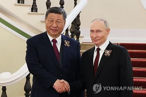 악수하는 중국·러시아 정상들러시아를 국빈방문한 시진핑(왼쪽) 중국 국가주석과 블라디미르 푸틴 러시아 대통령이 9일(현지시간) 러시아 전승절 열병식에 앞서 인사하는 모습. 2025.5.10[AFP=연합뉴스]