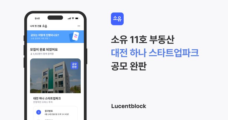대전 스타트업파크는 총 3개 동으로 구성되며, 이 중 1개 동은 핀테크 스타트업 루센트블록이 운영하는 부동산 조각투자 플랫폼 소유를 통해 지난 4월 일반 투자자를 대상으로 공모가 완판됐다. 소유는 상업용 부동산을 소액 단위로 증권화해 누구나 쉽게 투자할 수 있는 기회를 제공한다.