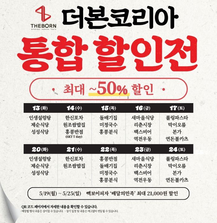 5월 13일부터 24일까지 2주간 진행되며, 요일별 지정된 브랜드의 매장 방문 식사 시 혜택을 받을 수 있다. 요일별 참여 브랜드는 5월 13일·20일(화) 인생설렁탕, 제순식당, 성성식당 5월 14일·21일(수) 한신포차, 원조쌈밥집 5월 15일·22일(목) 돌배기집, 홍콩분식, 미정국수 5월 16일·23일(금) 역전우동, 리춘시장, 새마을식당, 백스비어 5월 17일·24일(토) 연돈볼카츠, 롤링파스타, 본가, 막이오름 5월 22일(목) 홍콩반점 등이다.