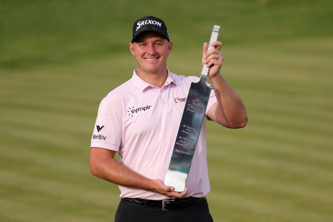 제프 슈트라카가 미국 PGA 투어 시그니처 대회 트루이스트 챔피언십에서 시즌 2승에 성공한 뒤 우승트로피를 들어 올리고 있다. (사진=AFPBBNews)