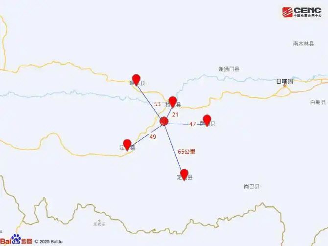 진원지는 라쯔현에서 21km, 석가현에서 47km, 딩그리현에서 49km, 앙렌현에서 53km, 딩지에현에서 65km, 시가체시시에서 136km, 라싸시에서 357km 떨어져 있다.