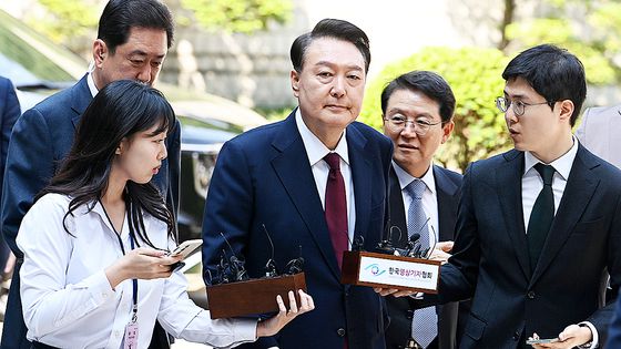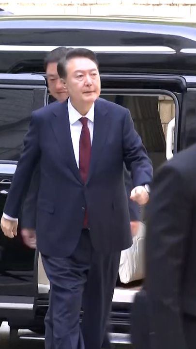 윤 전 대통령이 탄 차는 이날 오전 9시55분쯤 서울중앙지법 서관 입구에 나타났다. 차에서 내린 윤 전 대통령은 짙은색 정장에 빨간 넥타이 차림이었다.