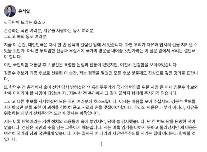 ◇ 김현정> 윤석열 전 대통령이 낙점했고 거기에 당권파가 합류하면서 한덕수 후보를 그렇게 끝까지 무리하게 좀 옹립하려고 했던 거 아니냐라는 분석이신데 그런데 박 의원님, 김문수 후보로 정해진 다음에 윤석열 전 대통령이 SNS에다가 응원하고 지지하는 글을 올렸는데요.