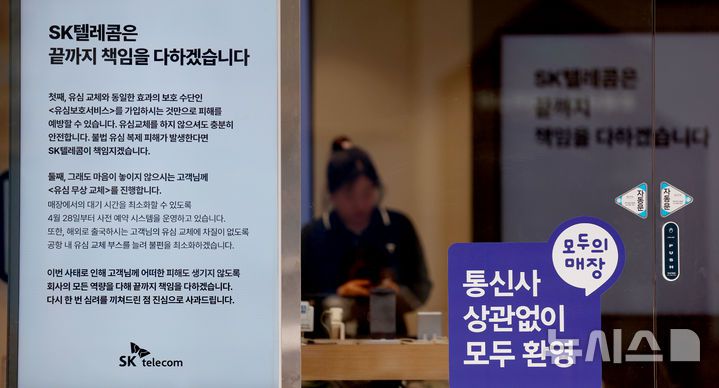 [서울=뉴시스] 김진아 기자 = SK텔레콤 정보 유출 사고로 유심 대란이 지속되고 있는 8일 서울 시내의 T월드 매장에 유심 교체 및 유심보호서비스 안내문이 게시되어 있다. SK텔레콤은 해킹 사고를 발표한 지난 22일부터 지난 7일까지 115만건의 유심을 교체했다고 8일 밝혔다. 2025.05.08. bluesoda@newsis.com