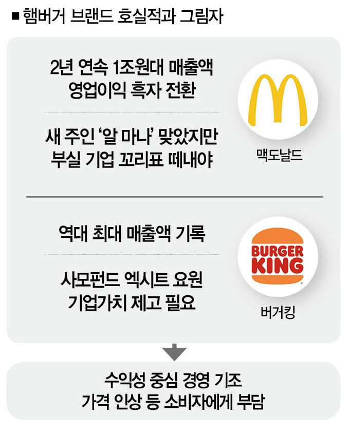이처럼 햄버거 브랜드의 '실적 홍보' 이면엔 불편한 이유들이 숨어 있다. 햄버거 브랜드로선 어쩔 수 없는 선택지일지 모르지만, 소비자에겐 부메랑이 날아갈 수밖에 없다. '김영호유통아카데미' 김영호 대표는 "외식 브랜드는 장기적이고 안정적인 운영 주체를 찾는 게 중요하다"면서 "잦은 손바뀜이 일어날 경우 투자금 회수를 위한 경영 기조가 강해질 수 있고 이는 소비자뿐만 아니라 가맹점주의 피해로 이어질 수 있다"고 꼬집었다. 맥도날드와 버거킹은 지금 누구를 위해 햄버거를 만들고 있는 걸까.