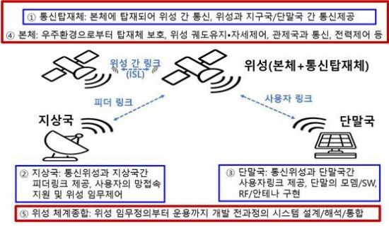 이 사업으로 위성과 지상 간, 위성과 위성 간 통신 기능을 수행하는 통신위성과 지상 시스템을 구축해 저궤도 위성통신 시범망을 개발하는 것이 핵심이다.