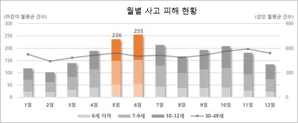 특히 어린이 교통사고는 날씨가 따뜻해지면서 외부 활동이 많은 시기인 5~6월에 집중됐다. 5월 평균 236건의 사고가 발생해 1~2월 평균(111건) 대비 2.1배, 전체 월평균(178건)보다 1.3배 많았다. 시간대로 보면 오후 2~7시 사이에 사고가 60% 이상 발생했다. 주로 하원·하교 또는 놀이 시간에 사고가 많았다.
