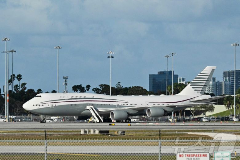 (웨스트 팜비치 AFP=뉴스1) 우동명 기자 = 지난 2월 15일 플로리다주 웨스트 팜비치에 있는 팜비치 국제 공항에서 보잉 747 항공기가 보인다. 도널드 트럼프 미국 행정부는 11일(현지시간) 카타르 왕실로부터 선물 받은 초호화 항공기인 보잉 747-8을 대통령 전용기(에어포스 원)로 사용하기로 했다. 2025.05.12 ⓒ AFP=뉴스1