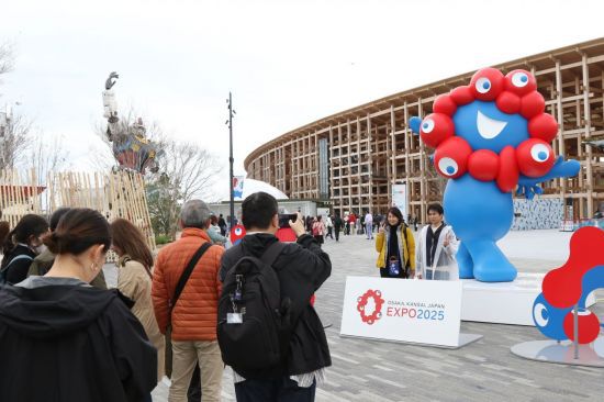 오사카·간사이 만국박람회(오사카 엑스포)가 개막한 13일 박람회장 내부에서 관람객들이 엑스포 캐릭터인 '먀쿠먀쿠'를 배경을 기념사진을 찍고 있다. 연합뉴스