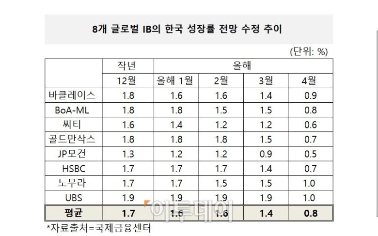 12일 국제금융센터에 따르면 4월말 기준으로 8개 글로벌 IB가 전망한 올해 우리나라 경제성장률(실질·전년대비 기준)은 0.8%로 집계됐다. 전월(1.4%)보다 0.6%p나 하락했다.