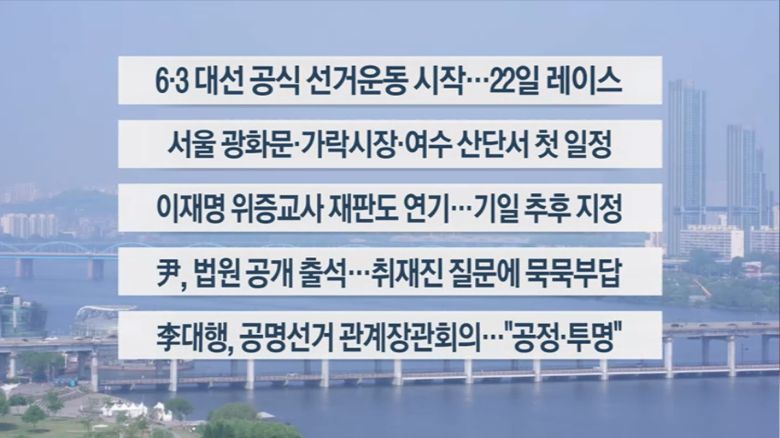 민주당 이재명 후보는 오전 서울 광화문 청계광장에서 첫 유세에 나섰습니다. 국민의힘 김문수 후보는 첫 일정으로 서울 가락시장을 찾았고, 이준석 개혁신당 후보는 여수 국가산업단지에서 일정을 시작했습니다.