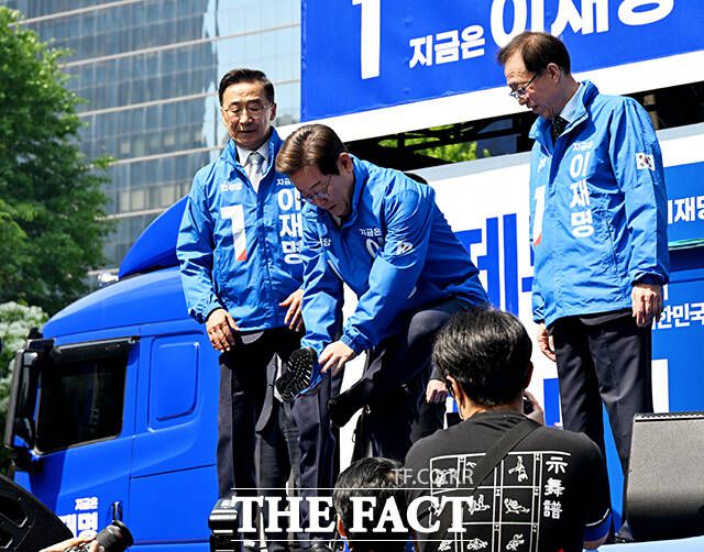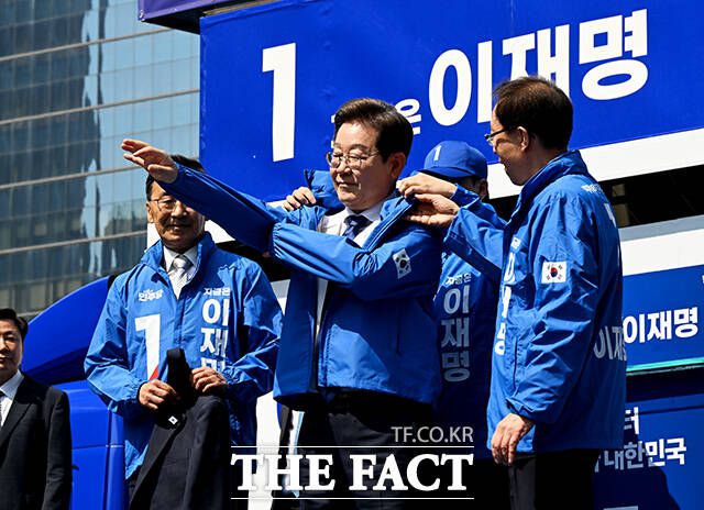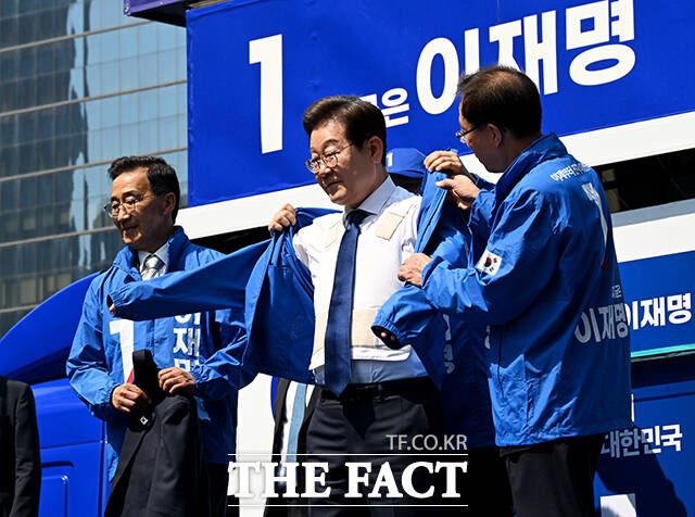 [더팩트ㅣ배정한 기자] 이재명 더불어민주당 대선 후보가 12일 오전 서울 중구 청계광장에서 열린 제21대 대통령 선거 출정식에 참석해 방탄조끼 위로 선거운동 점퍼를 착용하고 있다.