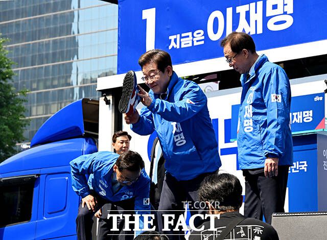이재명 더불어민주당 대선 후보가 12일 오전 서울 중구 청계광장에서 열린 제21대 대통령 선거 출정식에 참석해 방탄조끼 위로 선거운동 점퍼를 착용하고 있다. /배정한 기자 |