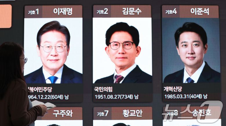제21대 대통령 선거 공식 선거운동이 시작된 12일 경기도 과천시 중앙선거관리위원회에 마련된 대통령선거 종합상황실 전광판에 후보자들의 사진이 게시돼 있다. 2025.5.12/뉴스1 ⓒ News1 박지혜 기자