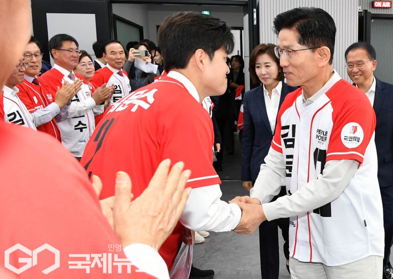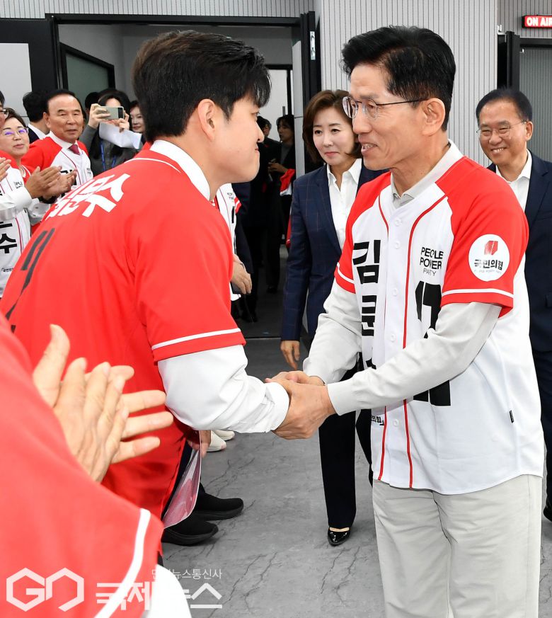 (서울=국제뉴스) 김문수 국민의힘 대선 후보가 12일 오전 서울 영등포구 여의도 국민의힘 중앙당사에서 열린 중앙선대위 임명장 수여식에서 공동선대위원장으로 내정된 김용태 의원과 인사하고 있다./사진=이용우 기자