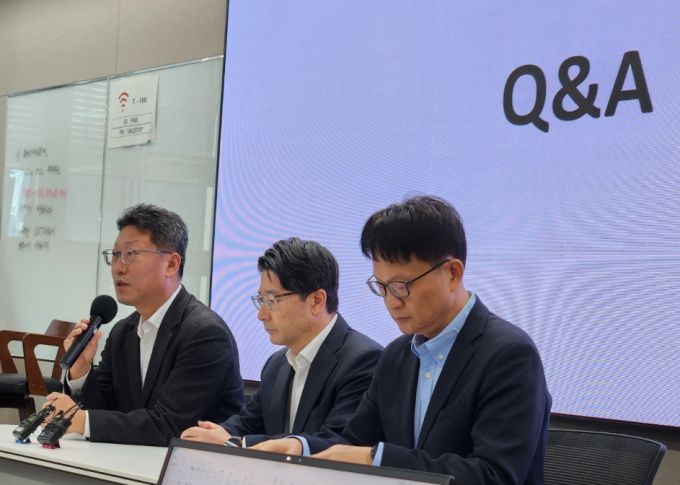 김희섭 SKT PR센터장, 임봉호 MNO 사업부장, 류정환 네트워크인프라센터장(왼쪽부터)이 일일브리핑을 하고 있다. /사진=SKT
