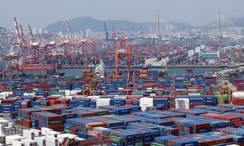 12일 부산 남구 신선대(사진 아래) 및 감만(위) 부두 야적장에 수출입 컨테이너가 가득 쌓여 있다. 뉴시스