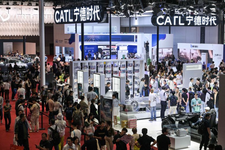 중국 상하이 국가전시컨벤션센터에서 4월 25일 열린 제21회 상하이 국제 자동차산업 전시회에서 참관객들이 배터리 대기업 CATL 부스를 둘러보고 있다. 상하이/AFP연합뉴스 |