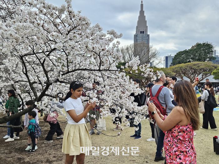 일본 도쿄를 찾은 외국인 관광객들이 벚꽃을 배경으로 사진을 찍고 있다. [도쿄 이승훈 특파원] |