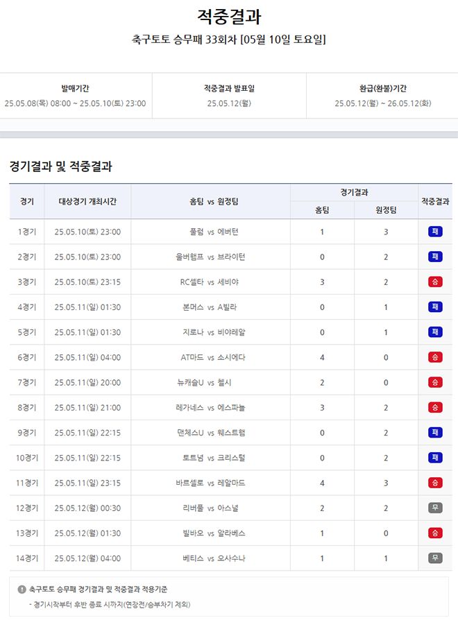 베트맨, 해외축구 14경기 대상 축구토토 승무패 33회차 적중결과 발표