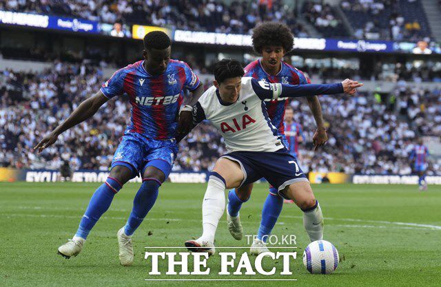 토트넘의 '캡틴' 손흥민이 11일 크리스탈 팰리스와 2024~2025 EPL 36라운드 홈 경기에 후반 32분 교체 투입돼 볼을 다투고 있다. 토트넘은 0-2로 패해 시즌 최다 패배 기록을 경신했다./런던=AP.뉴시스