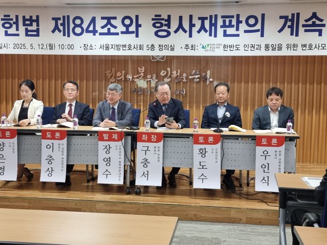 한반도인권과 통일을 위한 변호사모임(한변)은 12일 서울 서초구 서울지방변호사회관에서 '헌법 제84조와 형사재판의 계속'이란 주제로 세미나를 열었다. 이날 세미나에는 장영수 고려대 법학전문대학원 교수가 발제자로 나섰으며, 구충서 한변 부회장, 황도수 건국대 법학전문대학원 교수, 이충상 전 대법원 재판연구관, 우인식 변호사 등이 토론을 벌였다.