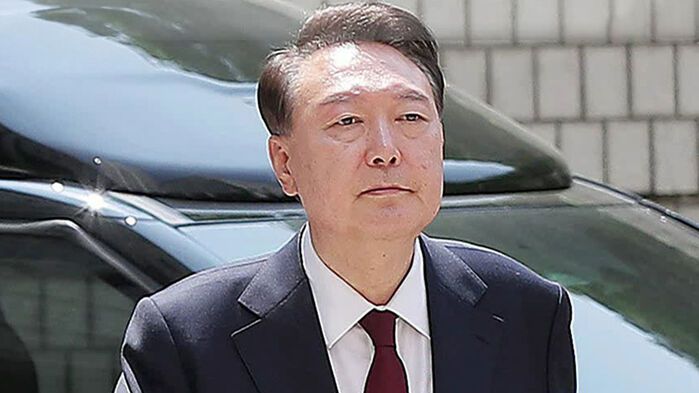 정장 차림에 빨간색 넥타이를 맨 윤 전 대통령은 경호차량에서 내려 걸어서 법정으로 이동했습니다.