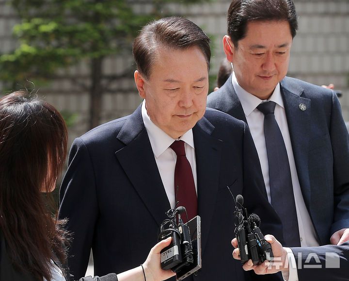 [서울=뉴시스] 사진공동취재단 = 내란 우두머리 혐의로 기소된 윤석열 전 대통령이 12일 서울 서초구 중앙지법에서 오후부터 재개되는 공판에 출석하고 있다. 2025.05.12. photo@newsis.com |