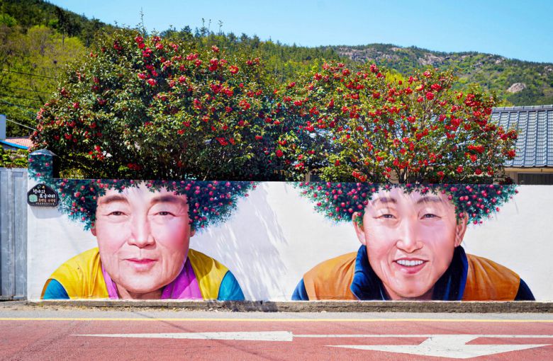 신안군 암태면에 가니 담벼락에 온화한 미소를 띤 부부 벽화가 여행객을 반기는 듯해 눈길을 사로잡습니다. 화려하고 생생한 그림과 담장 위로 올라온 동백나무가 참으로 재미나게 잘 어울립니다. 이충우 기자 |