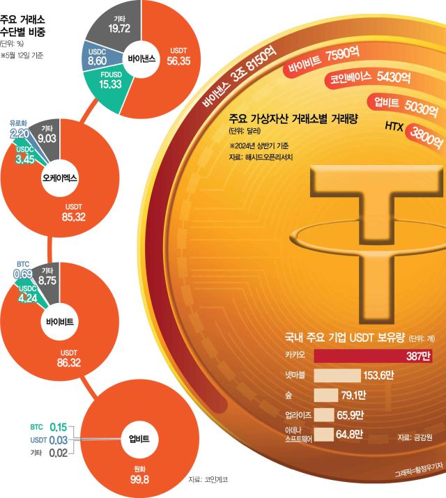 다른 글로벌 대형 거래소의 상황도 비슷하다. 오케이엑스는 USDT 85.32%, USDC 3.45%로 달러 스테이블코인이 전체 거래 대금의 89%를 차지하고 있으며 바이비트의 경우 USDT 86.32%, USDC 4.24%로 90%를 상회한다. 반면 국내 1위 거래소인 업비트에서도 USDT로 다른 가상자산을 거래할 수 있지만 거래 비중은 0.03%에 불과하다. 99% 이상이 원화 거래로 이뤄지고 있다. 국내에서는 가상자산 이용자들이 실명 계좌로 입금한 원화를 통해 가상자산을 사고판다면 다른 글로벌 거래소에서는 법정화폐 대신 USDT나 USDC 등으로 가상자산을 거래하는 것이 기본인 것이다. 가상자산 업계의 한 관계자는 “달러 스테이블코인이 시장 초기부터 주요 거래소들과 긴밀한 협력 관계를 이어간 데다 안정성과 편의성을 기반으로 이용자들에게도 많은 선택을 받으면서 선점 효과를 누리고 있는 것”이라고 설명했다.