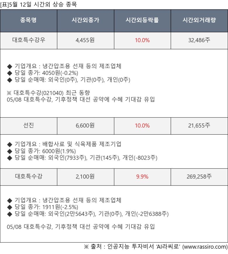 [표]5월 12일 시간외 상승 종목 및 최근 동향