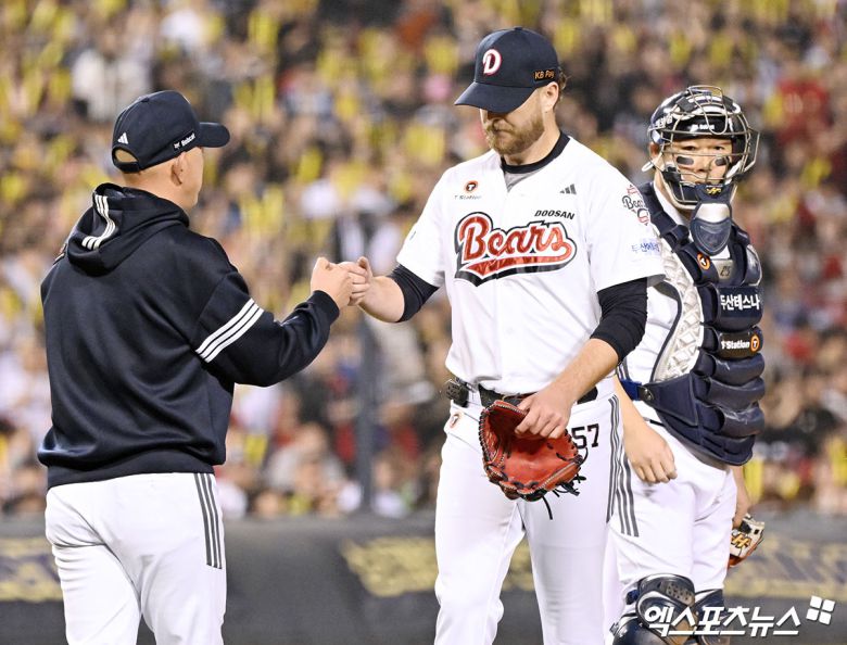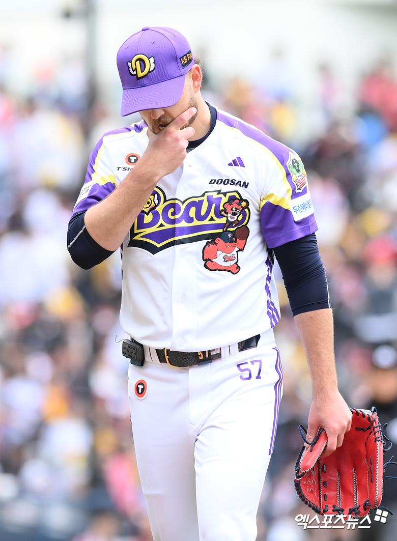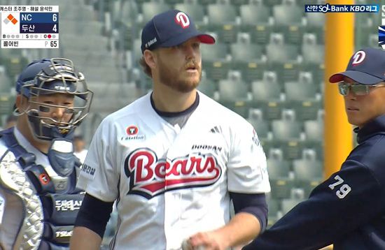 (엑스포츠뉴스 김근한 기자) 두산 베어스 1선발 에이스 외국인 투수 콜 어빈이 난데없는 어깨빵 논란에 휩싸였다. 조기 강판 지시에 박정배 투수코치와 포수 양의지를 어깨로 거세게 밀치면서 더그아웃으로 내려간 까닭이다. 거기에 어빈은 자신이 들고 있던 공까지 1루로 패대기치는 황당한 그림을 계속 연출했다.
