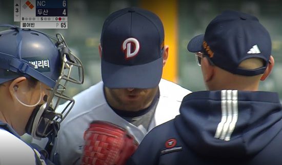 어빈은 3회 초 마운드에 올라 다시 박건우에게 사구, 최정원에게 희생 번트를 내줬다. 그리고 1사 2루 위기에서 어빈은 천재환과 8구 승부 끝에 또 볼넷을 허용했다. 여기서 두산 벤치가 결국 움직였다.