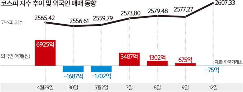 12일 한국거래소에 따르면 이날 코스피는 2607.33으로 마감했다. 장 초반 미국과 중국의 무역협상이 진전을 이뤘다는 소식에 상승 출발한 코스피는 이날 장중 2600.54로 일시적으로 2600선을 뚫었고, 결국 2600선을 탈환하는 데 성공했다. 코스피가 2600선에 올라선 것은 미국발 관세전쟁이 본격화한 지난 3월27일(2607.15) 이후 처음이다.