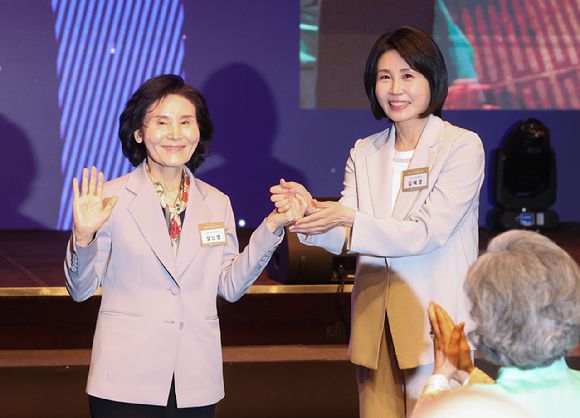 김문수 국민의힘 대선 후보의 부인 설난영 씨(왼쪽)와 이재명 더불어민주당 대선 후보의 부인 김혜경 씨가 12일 서울 중구 신라호텔에서 열린 중앙신도회 창립 70주년 기념식에서 손을 맞잡고 있다. 2025.5.12 [사진=연합뉴스] |