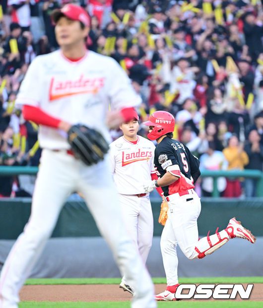 5회도 선두타자 이우성이 3루수 포구 실책으로 출루했다. 정해원을 볼넷으로 내보내 무사 1,2루 위기. 이 때 투수코치가 마운드를 방문해 한 번 호흡을 가다듬었다. 이후 김광현은 3루수 땅볼, 삼진, 유격수 땅볼로 범타 처리하며 실점없이 막아냈다.