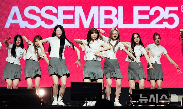 [서울=뉴시스] 황준선 기자 = 걸그룹 트리플에스(tripleS)가 12일 오후 서울 용산구 블루스퀘어에서 열린 정규 2집 어셈블25(ASSEMBLE25) 발매 쇼케이스에서 타이틀곡 '깨어' 무대를 선보이고 있다.  국내 최다 인원 걸그룹인 트리플에스의 정규 2집 어셈블25(ASSEMBLE25)에는 10개 트랙이 수록됐으며 타이틀곡 '깨어(Are You Alive)'는 얼터너티브 댄스 장르로 키치한 후크와 24인 멤버들의 다양한 색깔을 담아내는 구성이 감상 포인트다. 2025.05.12. hwang@newsis.com