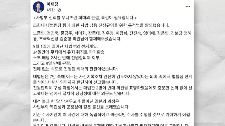 민주당 초선의원 모임 '더민초' 대표 이재강 의원은 오늘(12일) '조희대 특검법'을 발의한 뒤 SNS에 "대선 불과 한 달 남겨두고 휘몰아친 일련의 과정은 사법부의 독립성과 공정성에 깊은 불신을 초래했다"고 밝혔습니다.