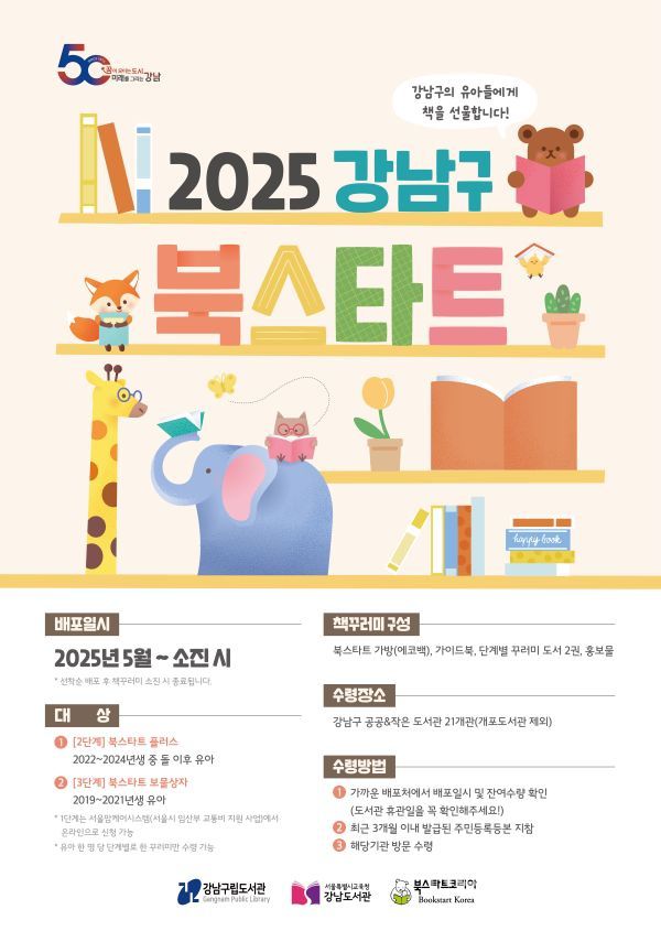 올해 강남구는 북스타트 플러스(2단계)에 더해 북스타트 보물상자(3단계)를 신규로 배포한다. 배포 대상은 강남구에 거주하는 유아이다. ▲북스타트 플러스(2단계)는 2022~2024년생 중 12개월이 지난 유아, ▲북스타트 보물상자(3단계)는 2019~2021년생 유아가 해당한다.