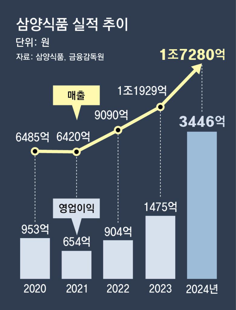 주가뿐만 아니라 실적도 상승세를 보이고 있다. 지난해 삼양식품은 매출 1조7280억 원으로 2020년 6485억 원 이후 4년 만에 매출이 2.5배 넘게 증가했다. 같은 기간 영업이익은 953억 원에서 3446억 원으로 3배 넘게 증가했다. 2016년 26%에 불과했던 해외 매출 비중은 2020년 57%, 지난해엔 77%까지 올랐다.