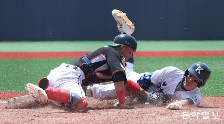 경남고 ‘통한의 주루사’ 경남고 박보승(오른쪽)이 12일 서울 양천구 신월야구장에서 열린 제79회 황금사자기 전국고교야구대회 겸 주말리그 왕중왕전 16강전 9회초 2사 후 홈에서 물금고 포수 윤지유에게 태그아웃당하고 있다. 박보승은 우익선상으로 빠지는 3루타를 친 뒤 상대 야수진의 연결 플레이 때 홈을 파고들었으나 주루사하고 말았다. 물금고는 6-5 한 점 차 리드를 지켜내며 2015년 창단 후 처음으로 황금사자기 8강에 올랐다. 신원건 기자 laputa@donga.com |